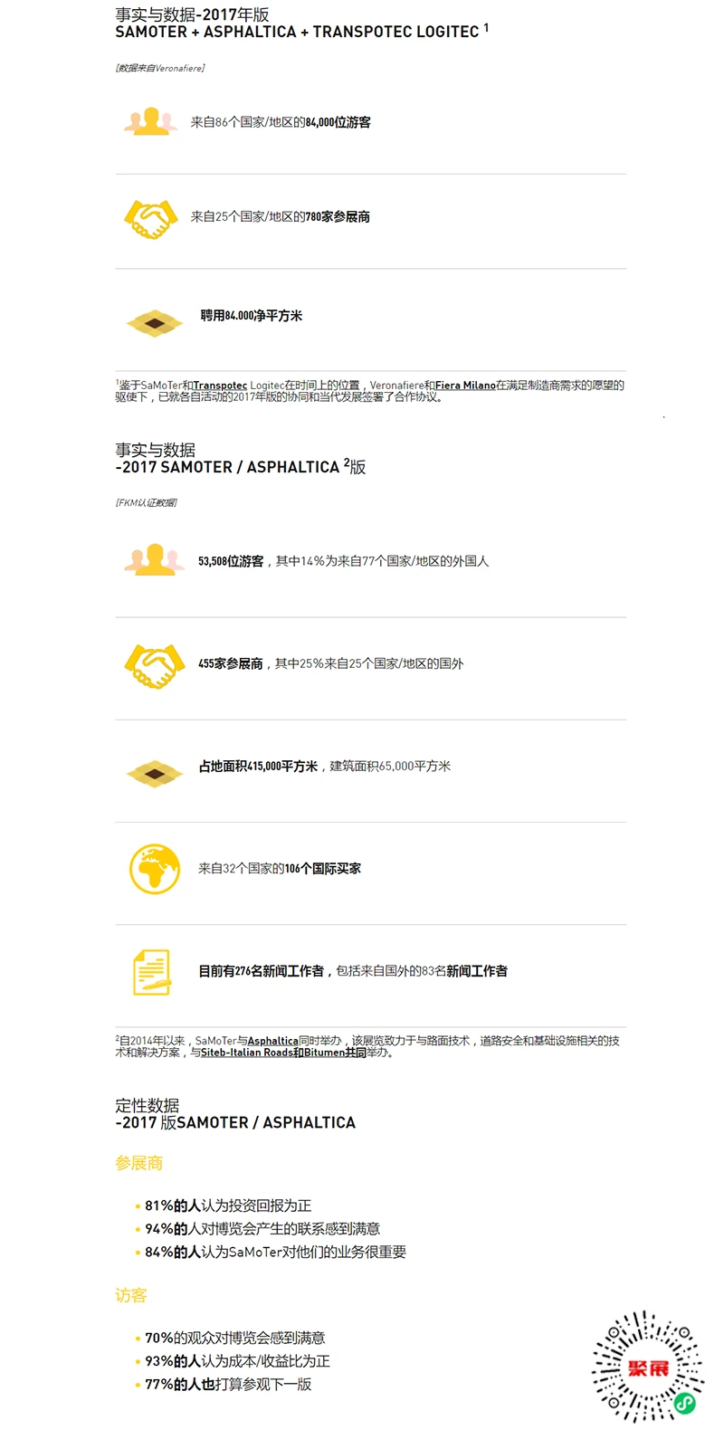 Triển lãm SAMOTER trước đó tại Verona, Ý, có tổng diện tích 118.000 mét vuông, với 909 nhà triển lãm đến từ các quốc gia bao gồm Trung Quốc, Đức, Pháp, Anh, Nga, Cộng hòa Séc, Tây Ban Nha, Brazil và Ấn Độ, và thu hút 98.048 khách tham quan.