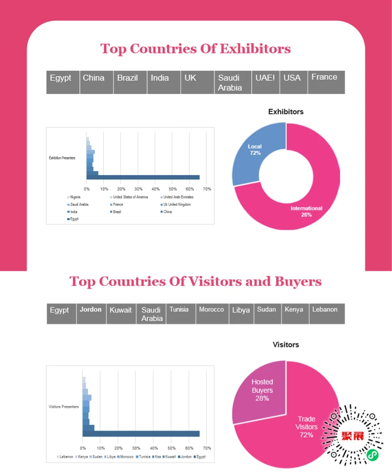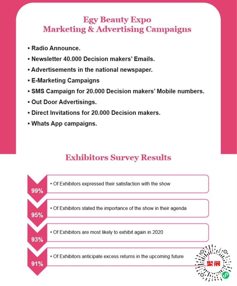 Là một triển lãm thương mại B2B chuyên nghiệp, Triển lãm Mỹ phẩm và Làm đẹp Ai Cập thu hút người mua từ Bắc Phi và khắp thế giới. Egypt Beauty Africa là nơi quy tụ hàng đầu dành cho các chuyên gia làm đẹp và những người ra quyết định từ thị trường Tây và Bắc Phi. Các sự kiện bao gồm các hội thảo do tất cả các chuyên gia làm đẹp và mỹ phẩm tổ chức, cũng như các sản phẩm và công nghệ mới được các nhà triển lãm trưng bày.