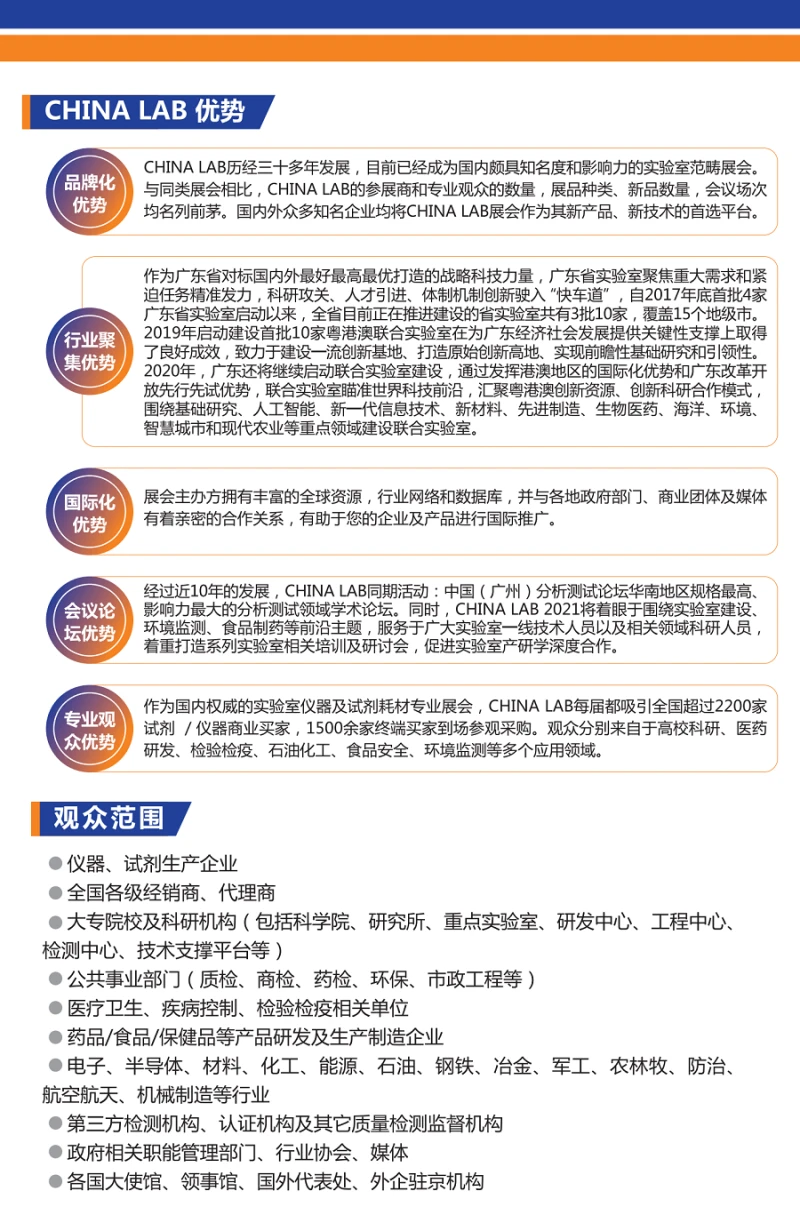 Triển lãm Thiết bị Phòng thí nghiệm và Kiểm nghiệm Phân tích Quốc tế Quảng Châu (CHINA LAB) phục vụ toàn bộ chuỗi giá trị công nghệ và xây dựng phòng thí nghiệm. Có trụ sở tại miền Nam Trung Quốc, triển lãm này lan tỏa khắp Trung Quốc và Đông Nam Á. Với trọng tâm là các dụng cụ, thiết bị, hóa chất và vật tư tiêu hao phòng thí nghiệm, triển lãm bao gồm quy hoạch, thiết kế, xây dựng, vận hành, phần mềm, quản lý và đầu tư phòng thí nghiệm. Thông qua các cuộc triển lãm và diễn đàn, triển lãm cung cấp một nền tảng tương tác cho các chuyên gia trong lĩnh vực phòng thí nghiệm để quảng bá, giao dịch, trao đổi và học hỏi, đồng thời cung cấp các giải pháp toàn diện cho các phòng thí nghiệm.